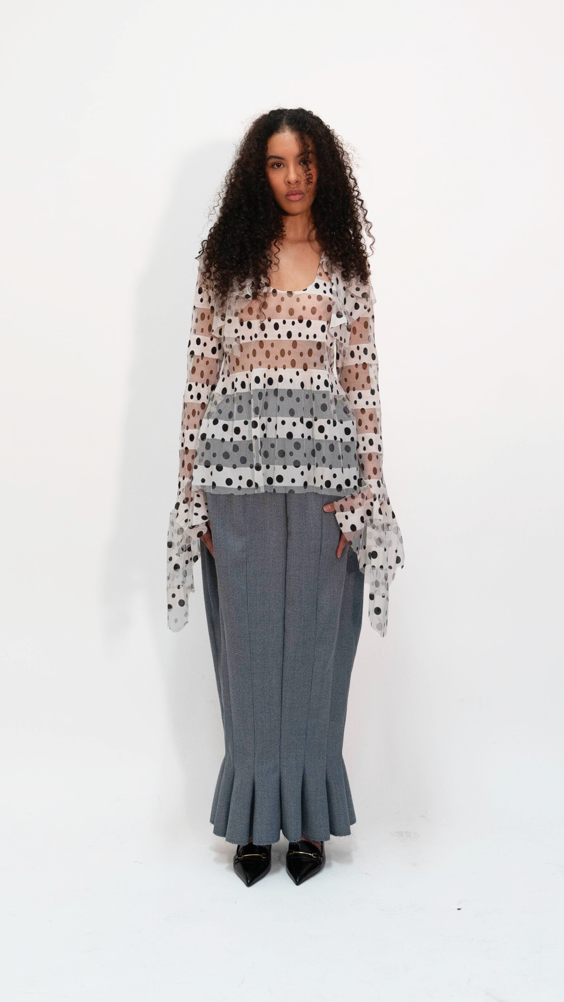 Blouse en tulle léger avec motif pois et rayures. Manches longues fluides et coupe ample. Double col à volants.