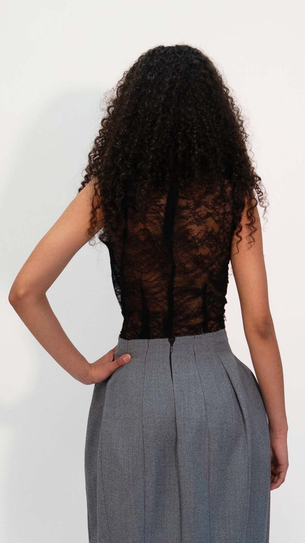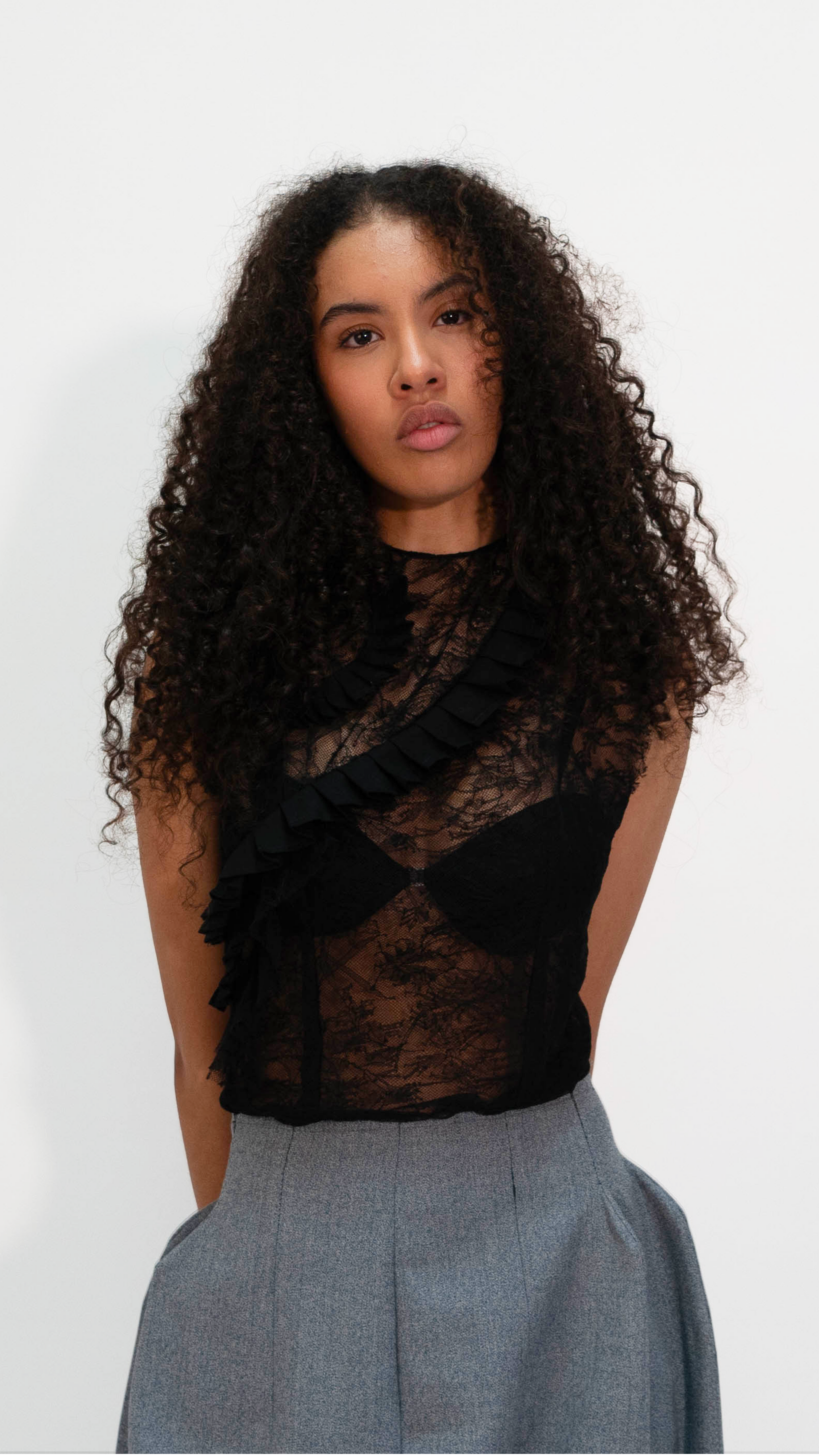 Top en dentelle de calais noire jouant sur la transparence. Des volants structurés traversent l’ensemble.