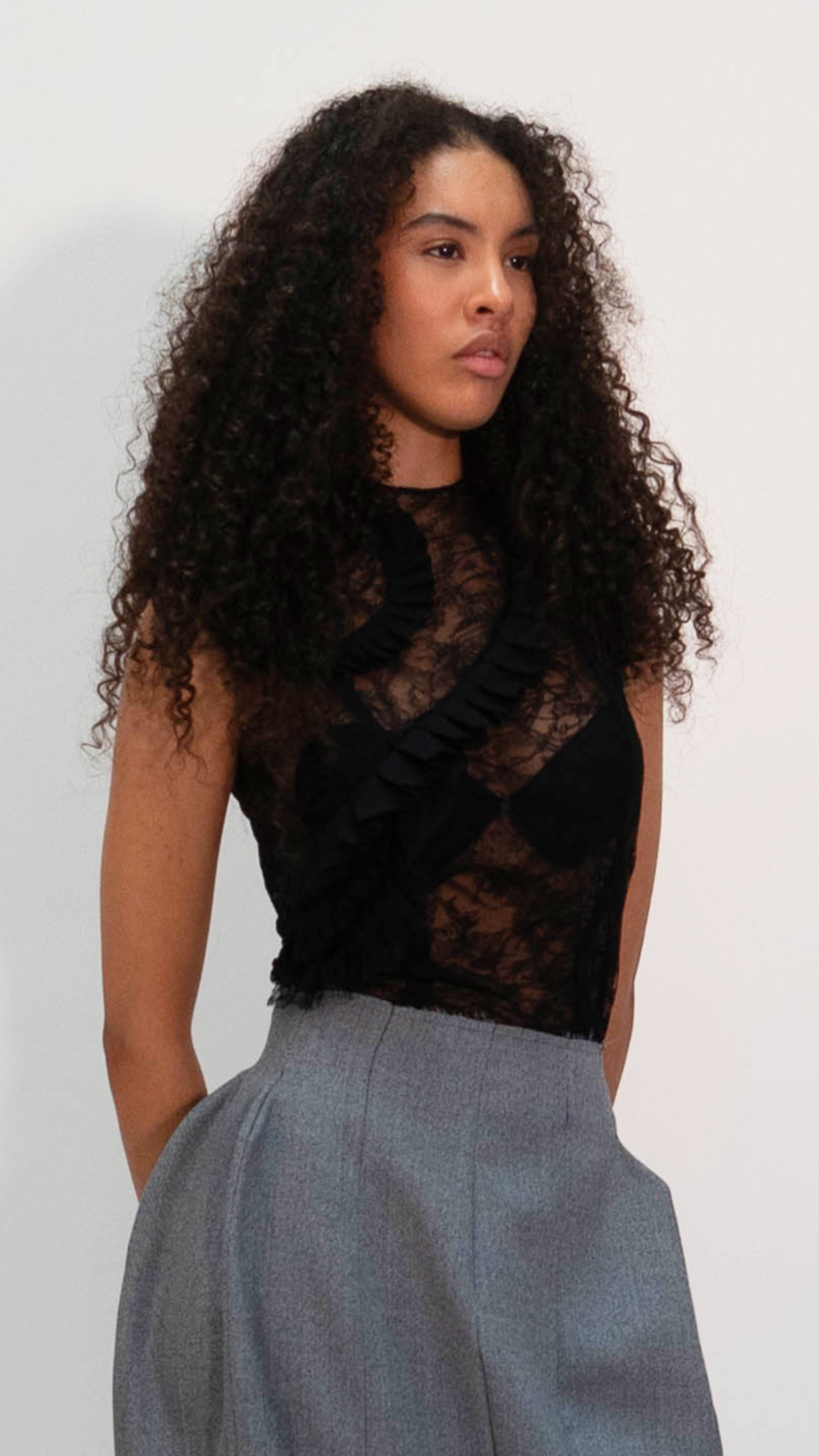 débardeur en dentelle de Calais noire et à volants structurés